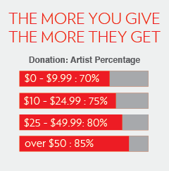 Pledges are made to Art Micro Patronage, which then pays the intended artists. Art Micro Patronage retains a small percentage in order to pay future curators and developers, pay transaction processing fees, and to maintain the site’s existence. In order to incentivize giving, larger donations result in a smaller percentage taken by AMP and higher fees for artists.